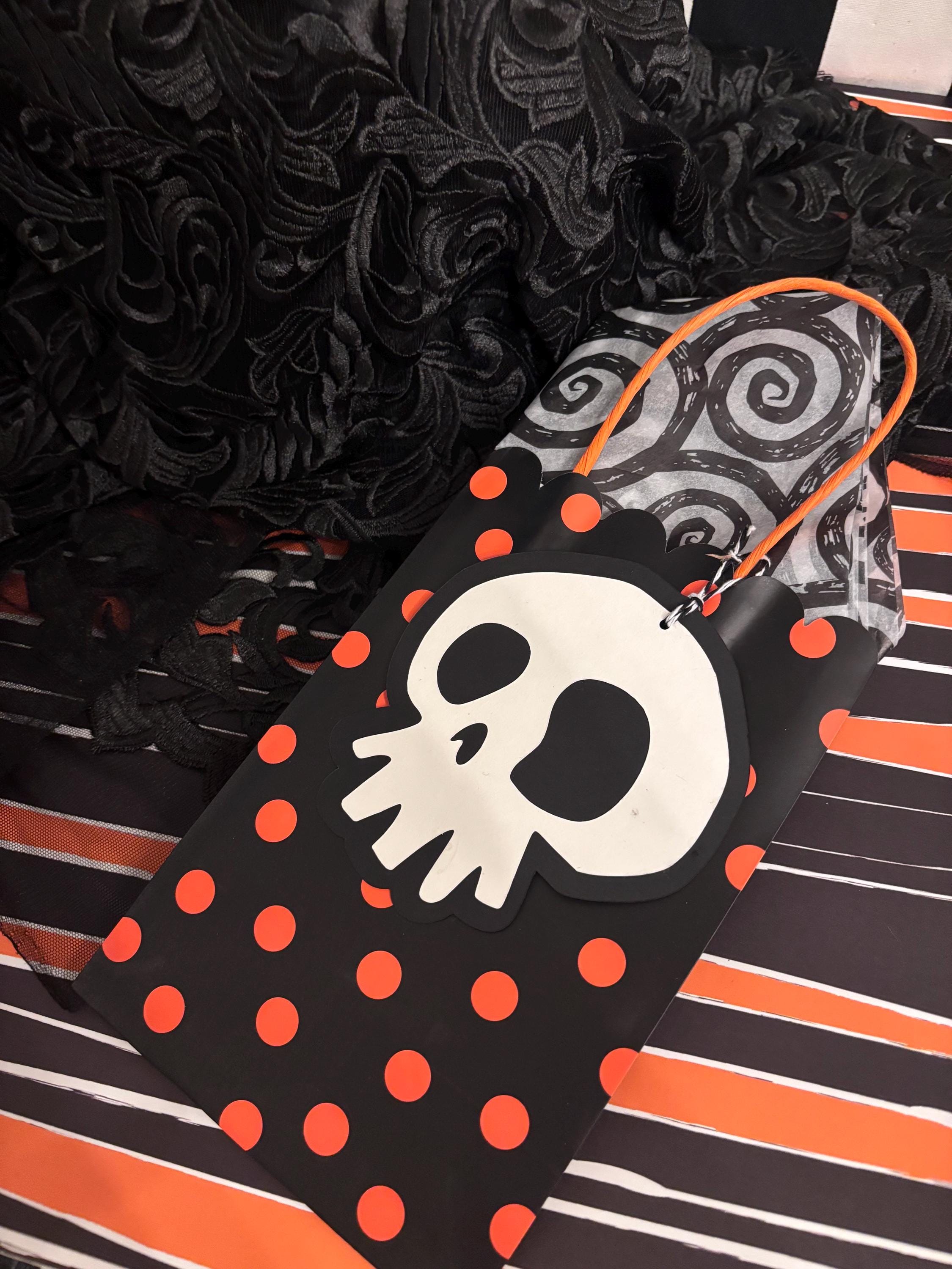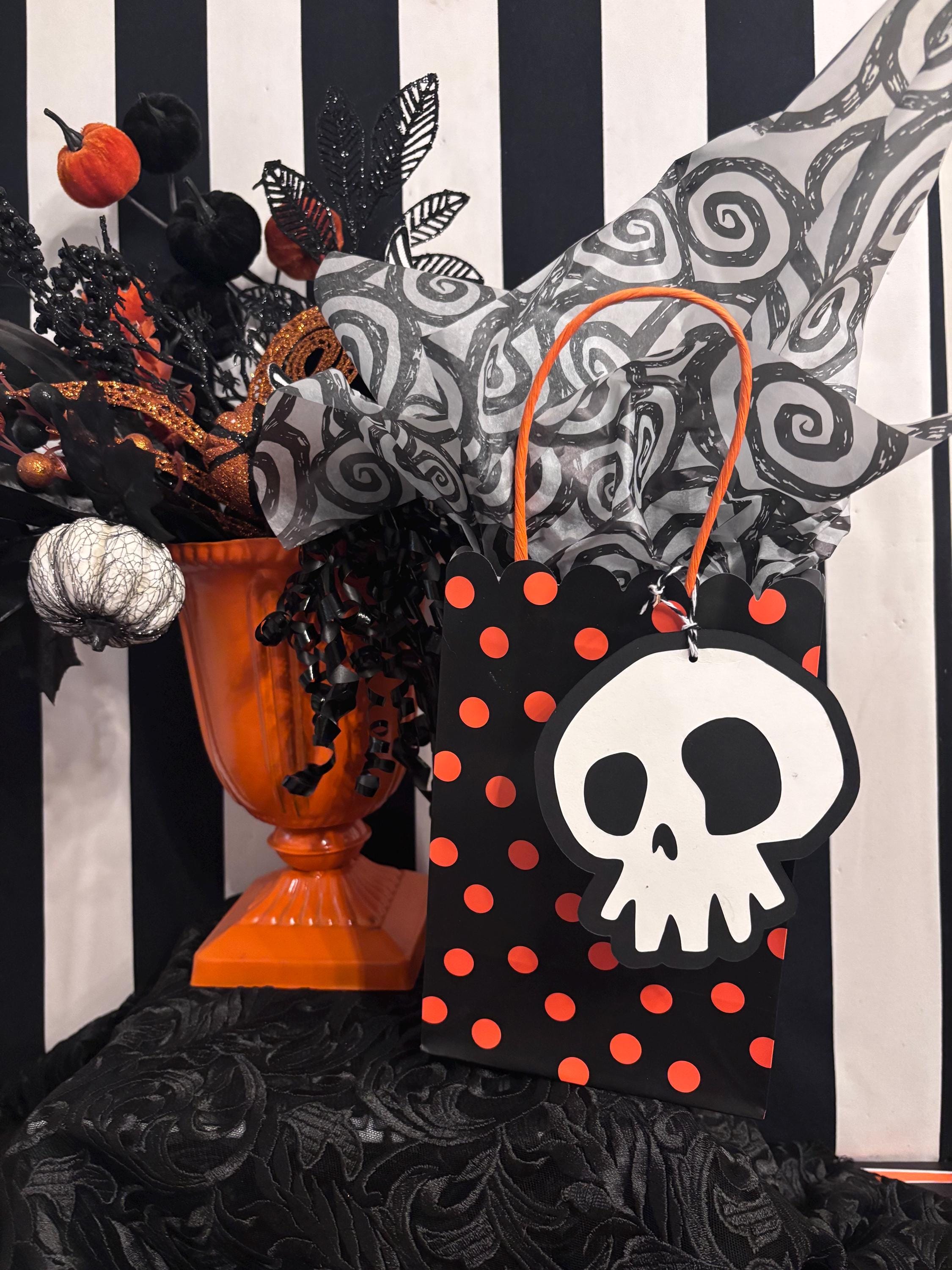 Trick or Treat! These Boo Bags are for those extra special trick or treaters that ring your doorbell or have an especially perfect costume! you know, the ones you save those king-size candy bars for?! This Boo Bag set contains a polka dot gift bag complete with a Skully gift tag attached and one sheet of our Nightmare Swirl Tissue paper!