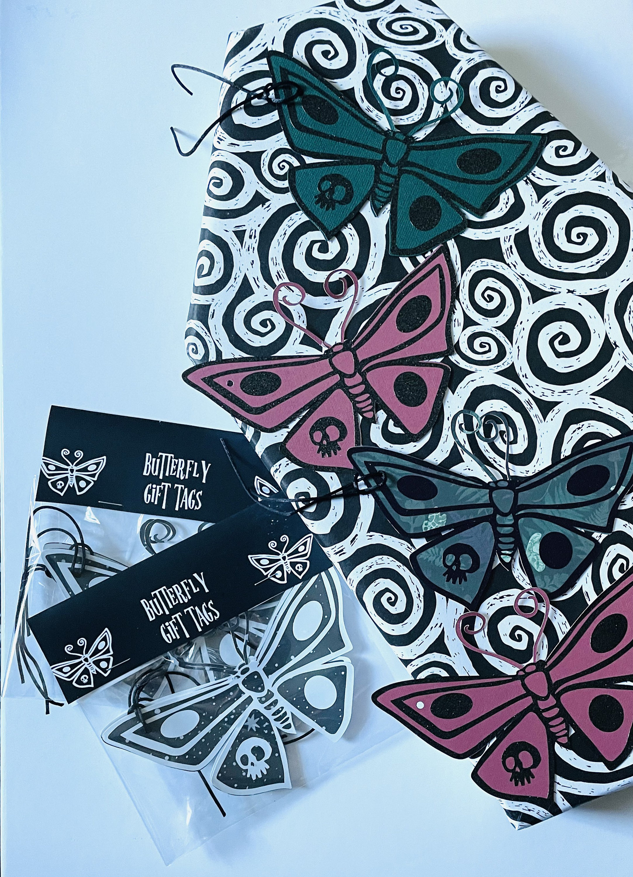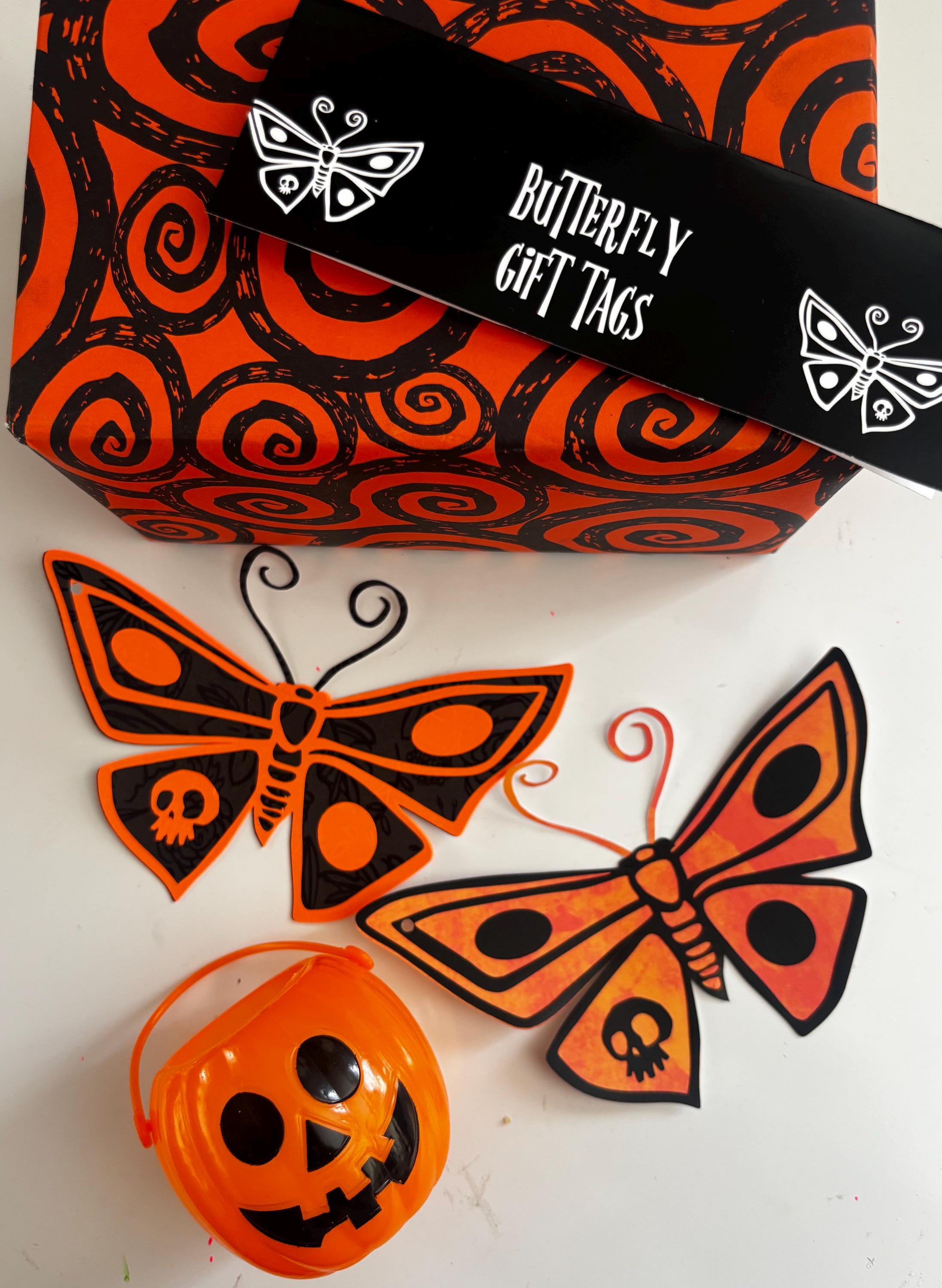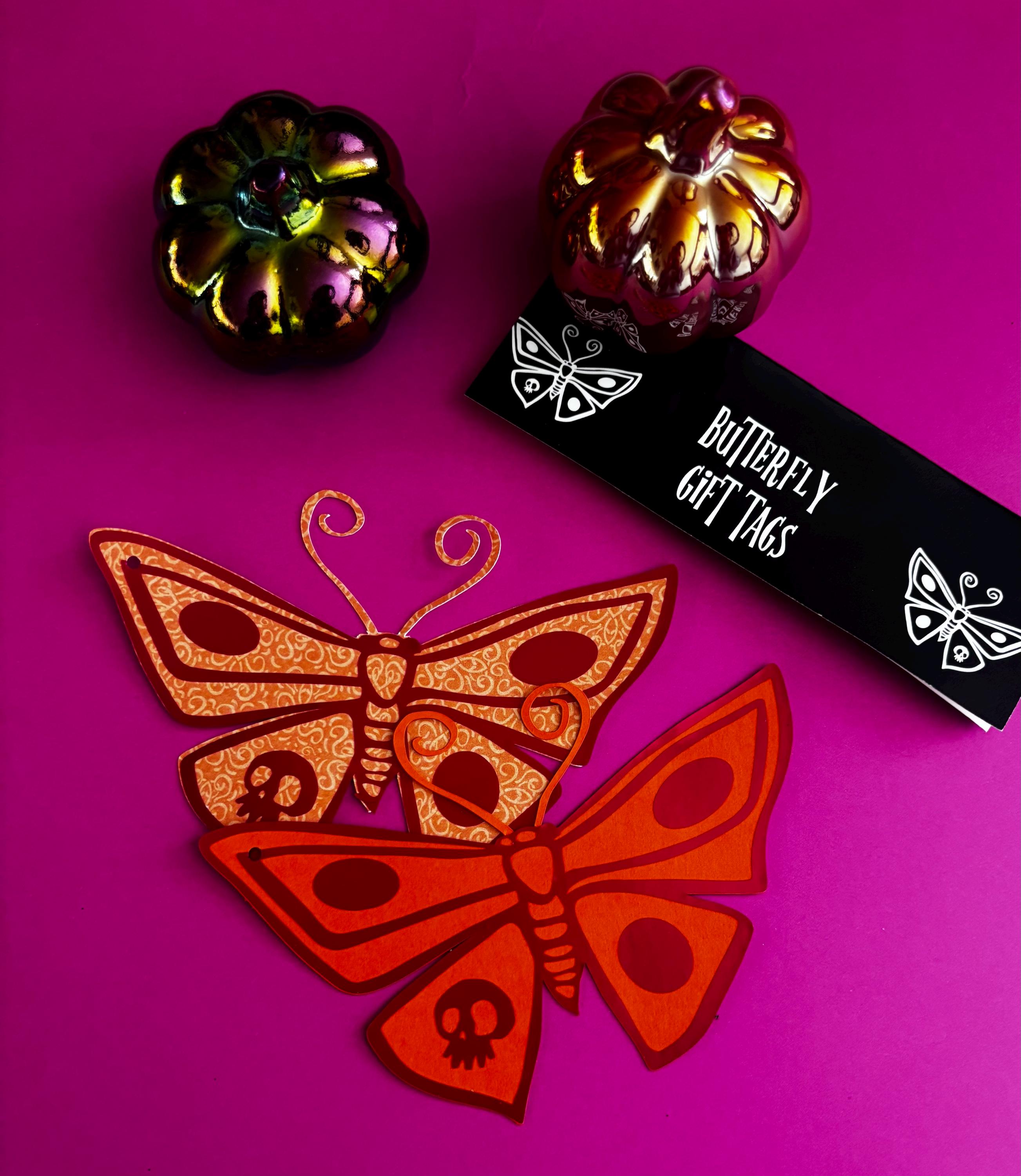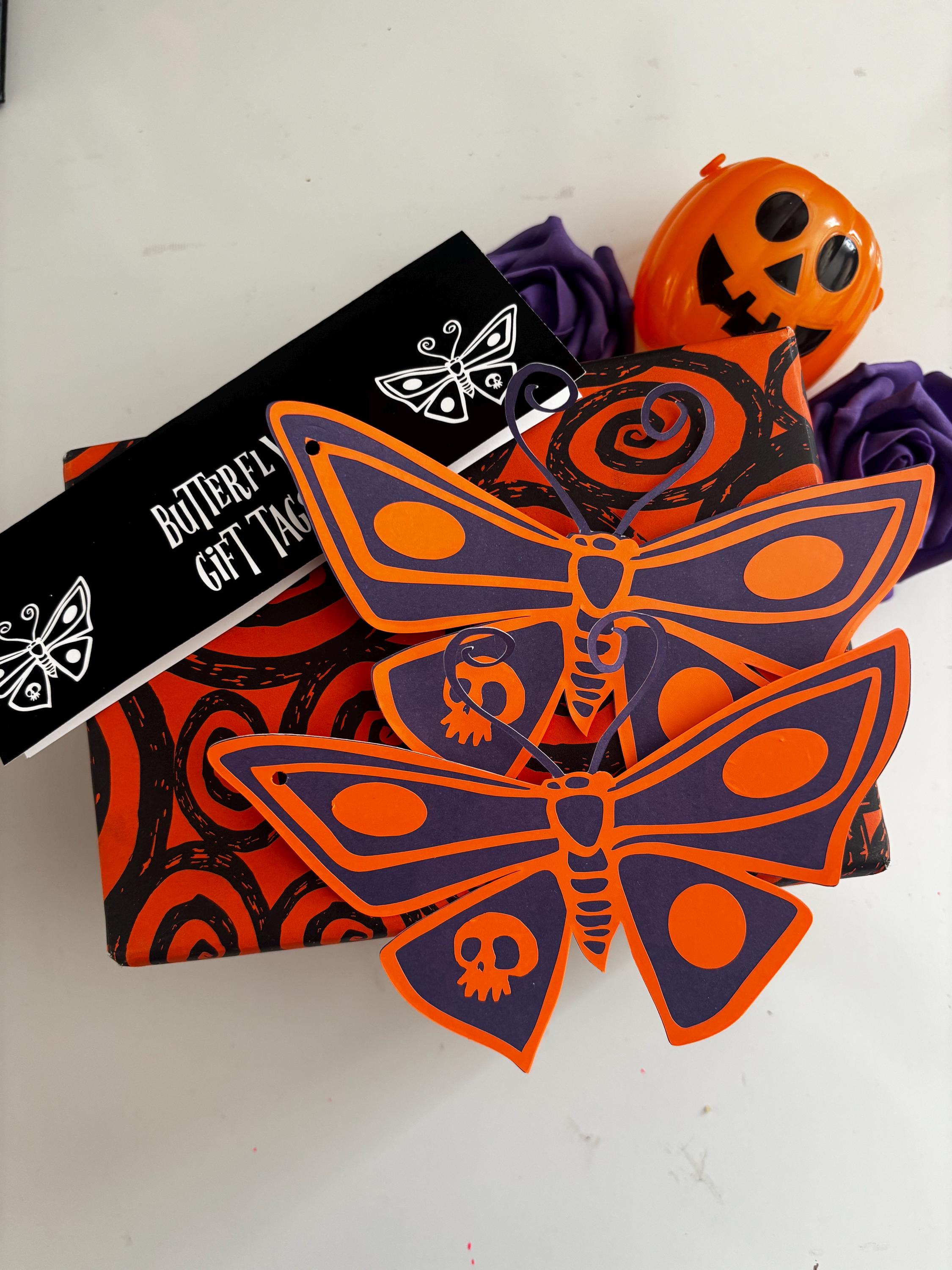 These gift tags are cardstock butterfly cutouts with vinyl details We used the Corpse Bride butterfly for inspiration, we just added some new colors! There are two tags in each pack. Each tag is attached with black twine. These are a medium sized gift tag, 5.51” wide x 3.8” tall. There are a few different color combos: -Purple & Orange -Orange & Pink -Black & Orange
