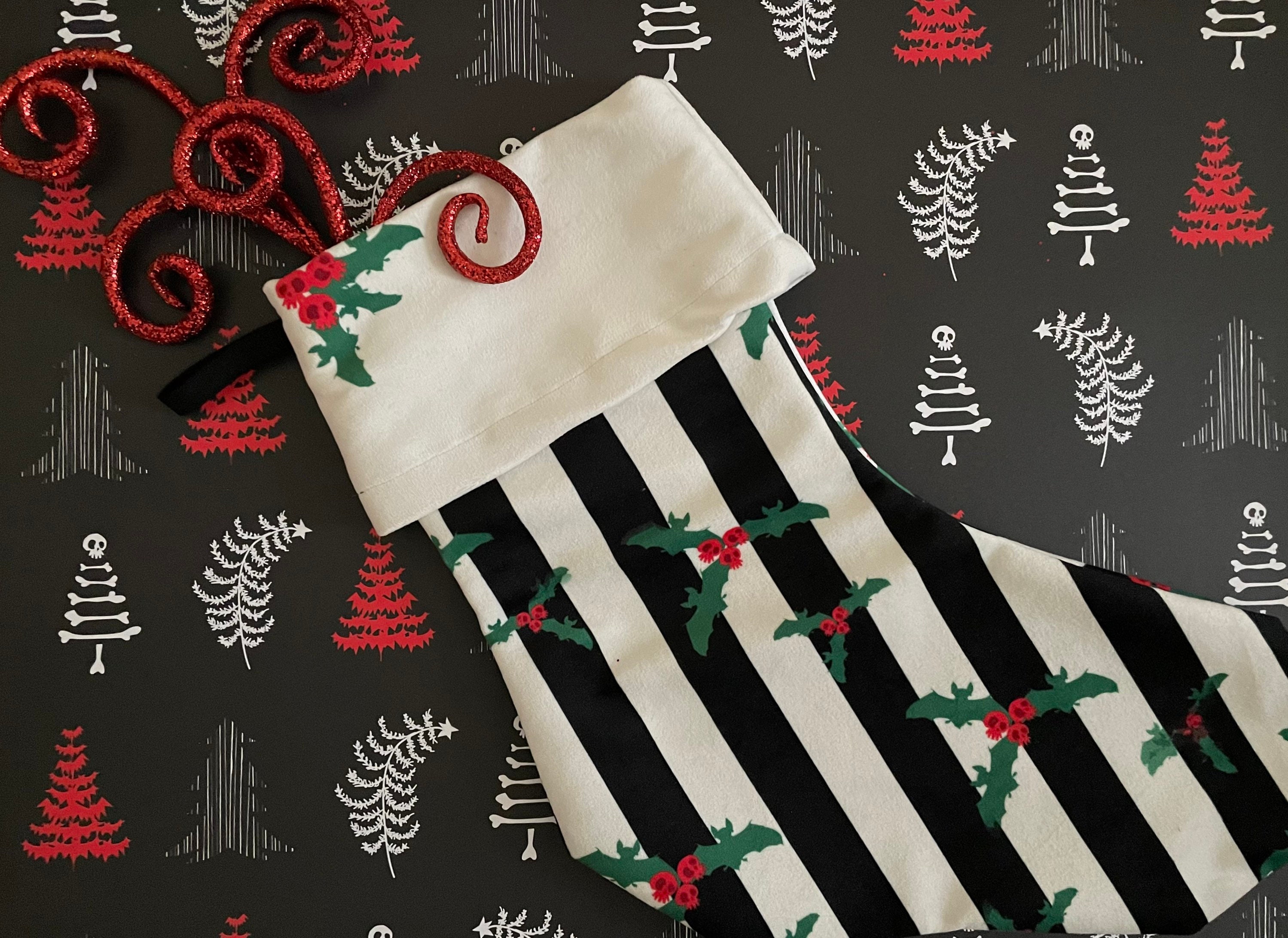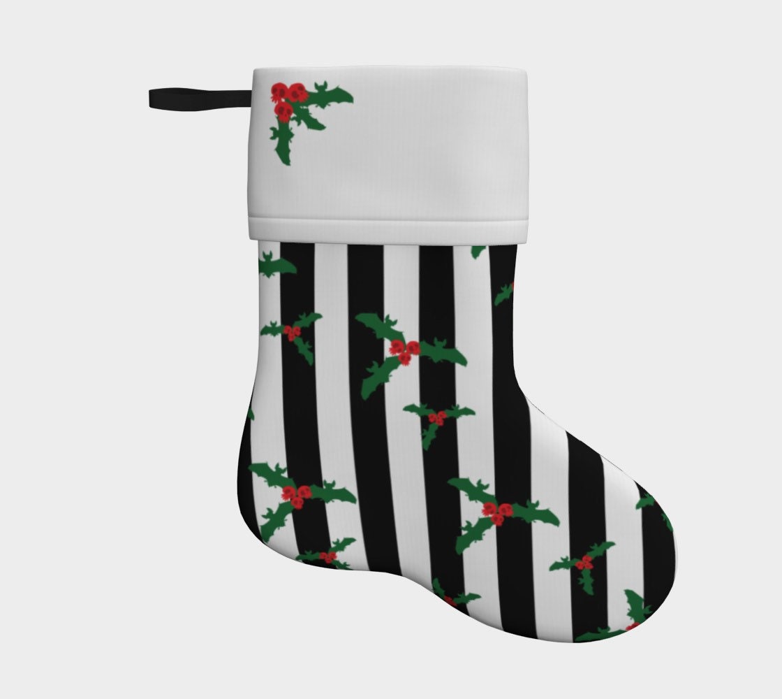 Deck the halls and make your house scary with our brand new Holiday stockings! Mistleskulls is our most popular holiday print and this stocking is printed in full color front & back! The fold over cuff is white and has a tiny little Mistleskull in the corner! The full length of the stocking is 18" long and the top of the stocking is 8.25" wide and the bottom is 14" long