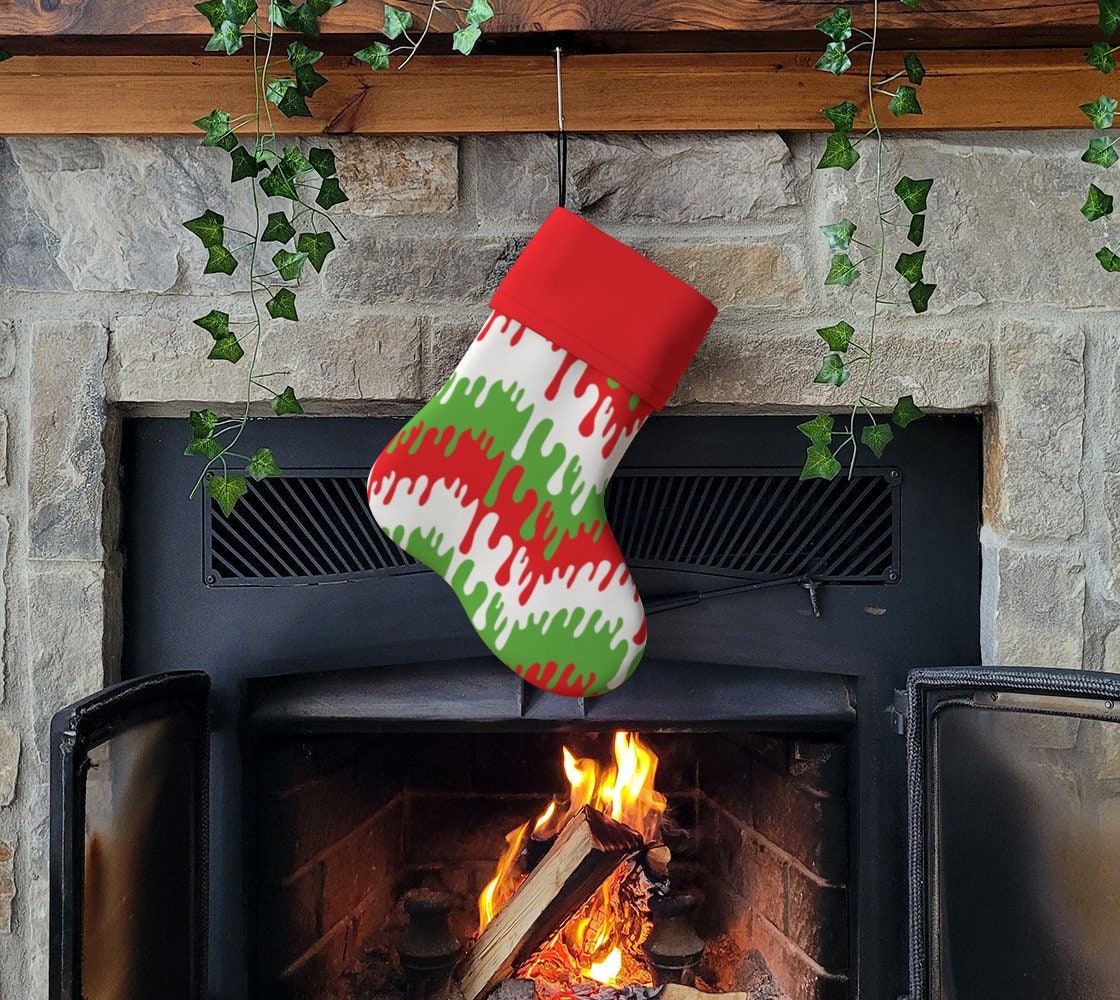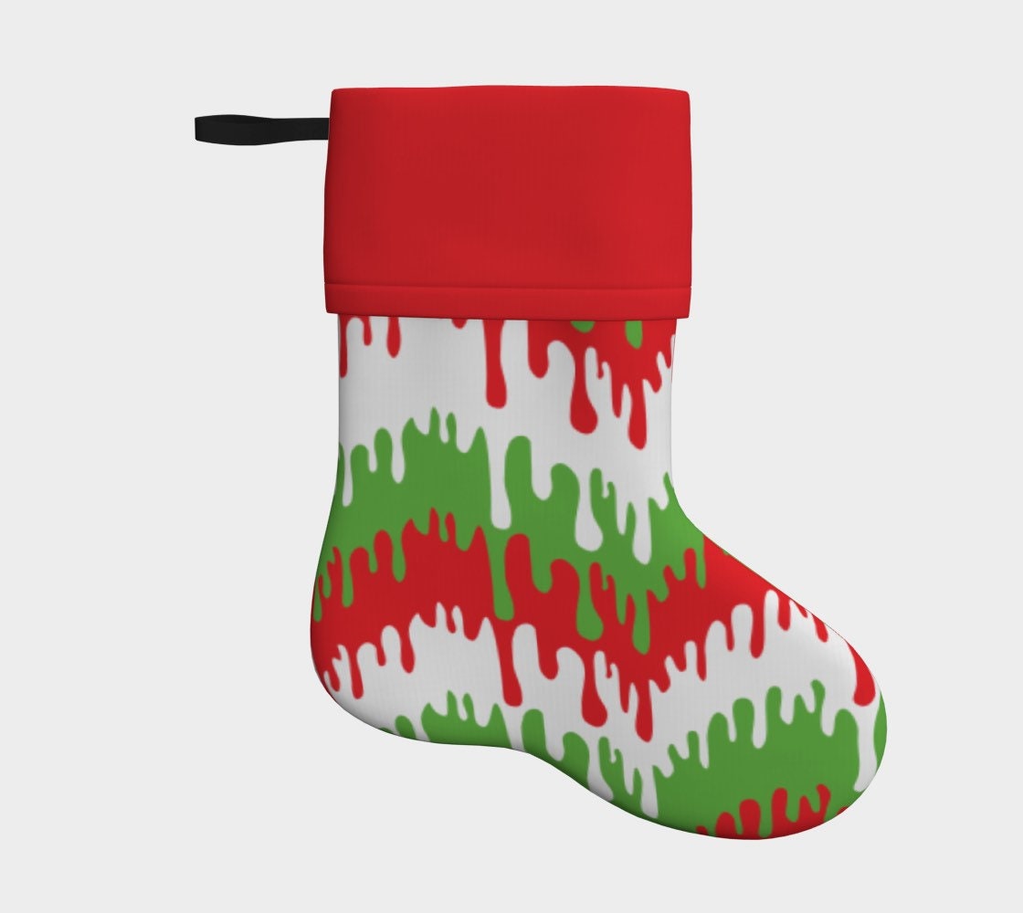 This stocking is dripping with Christmas Slime and is bound to make any Grinch’s heart grow three sizes too big! Red, green, and white slime drips down this stock and a bright red fold over cuff helps all the colors stand out!