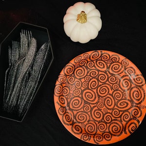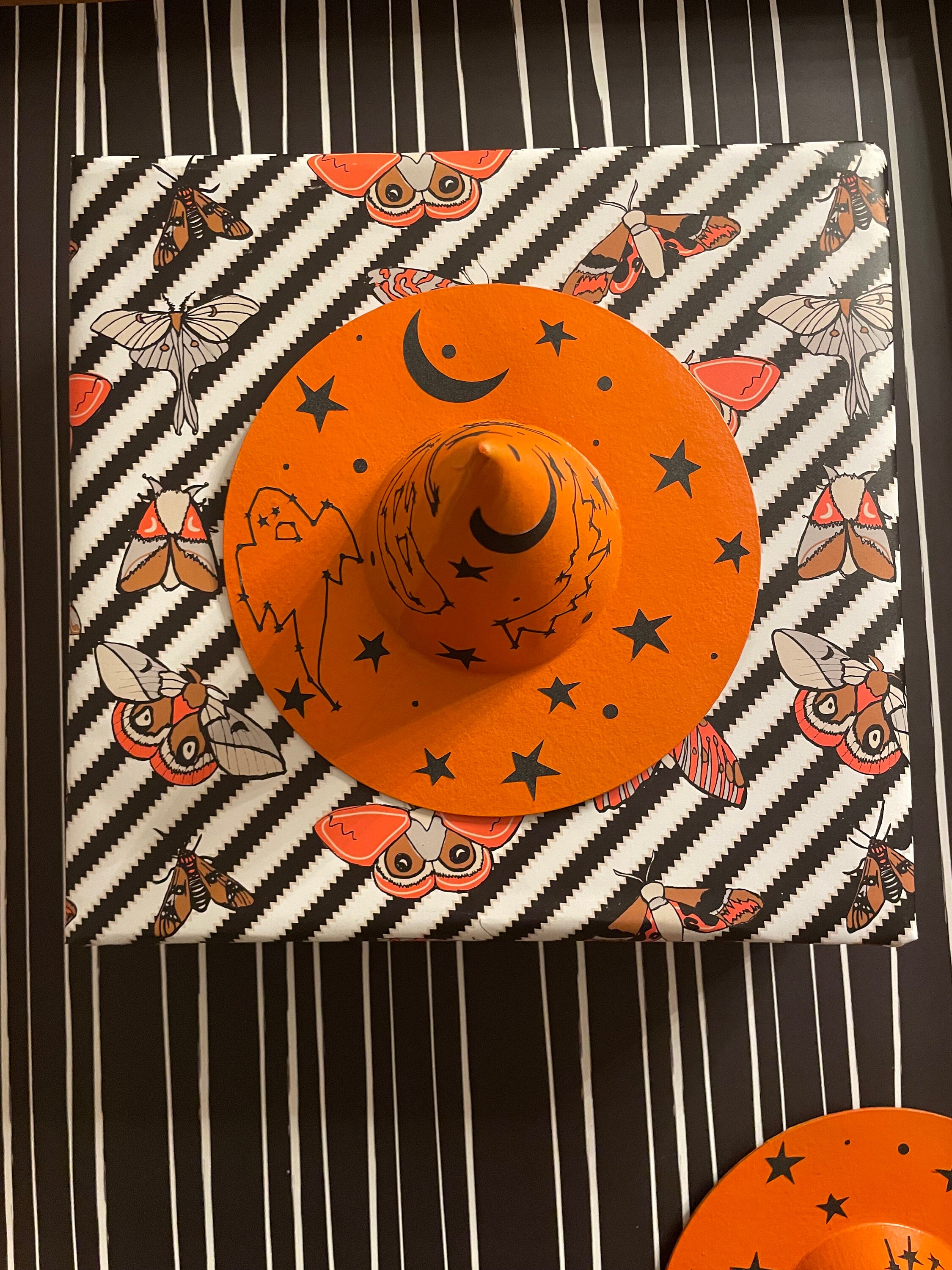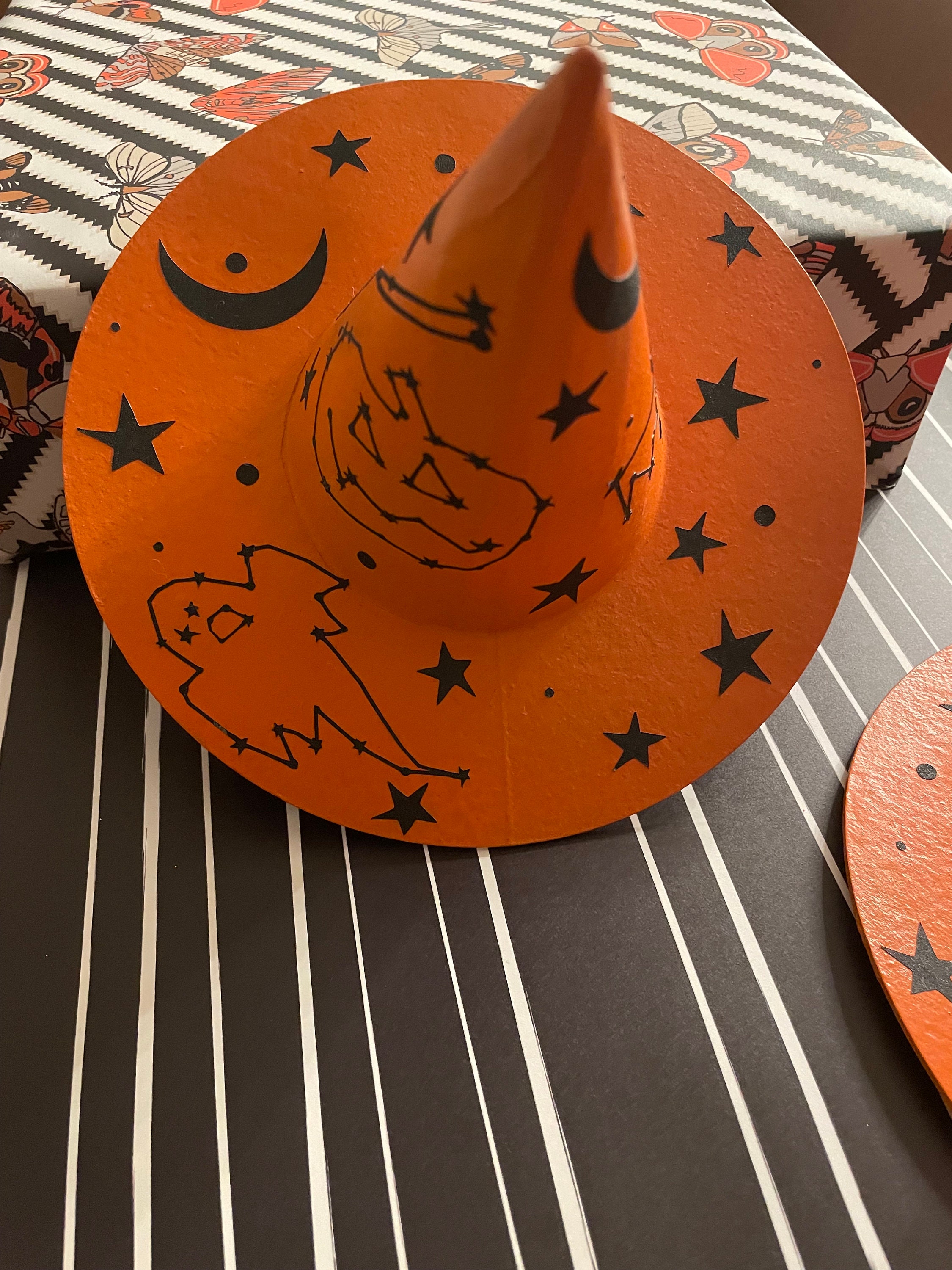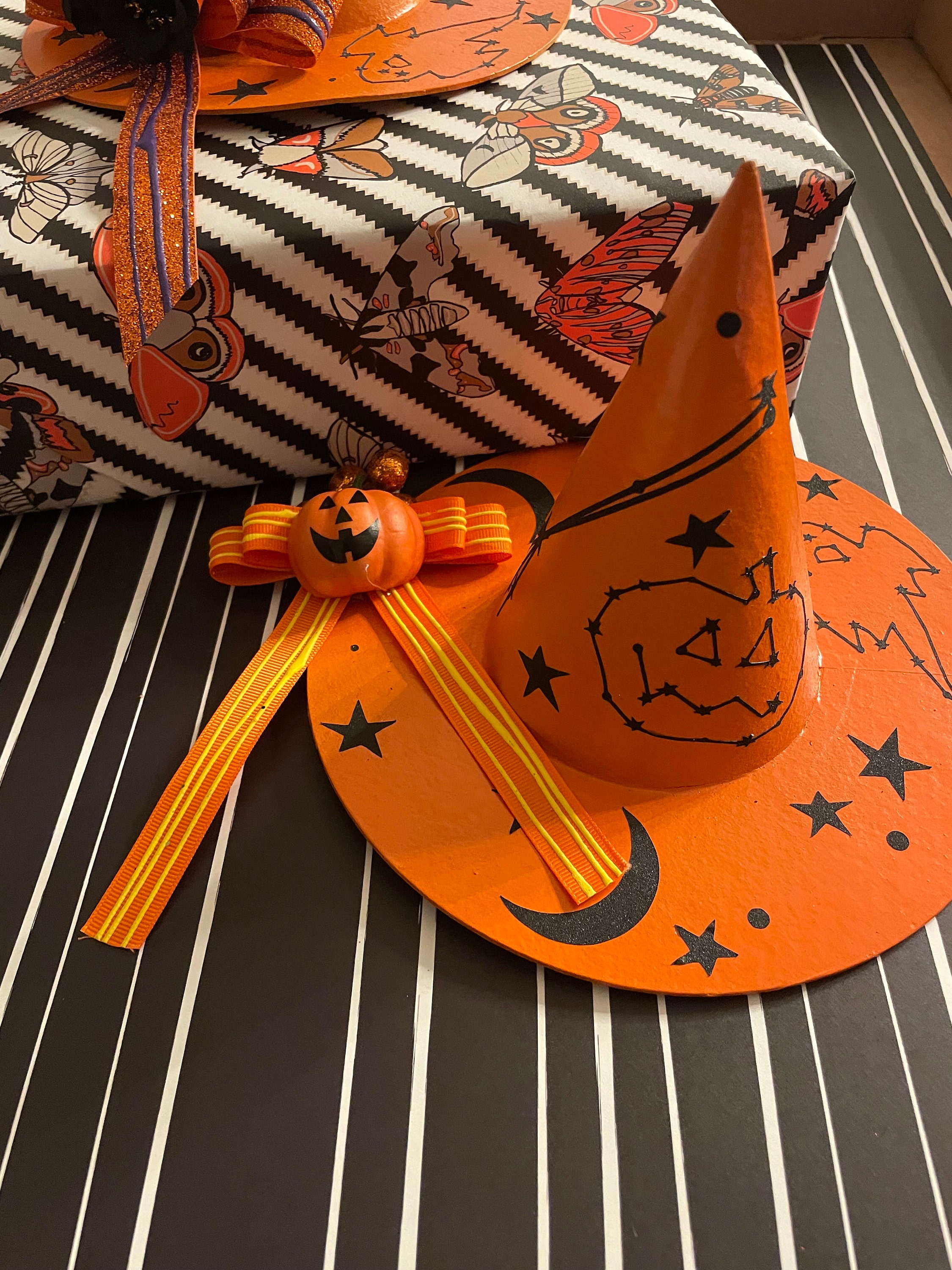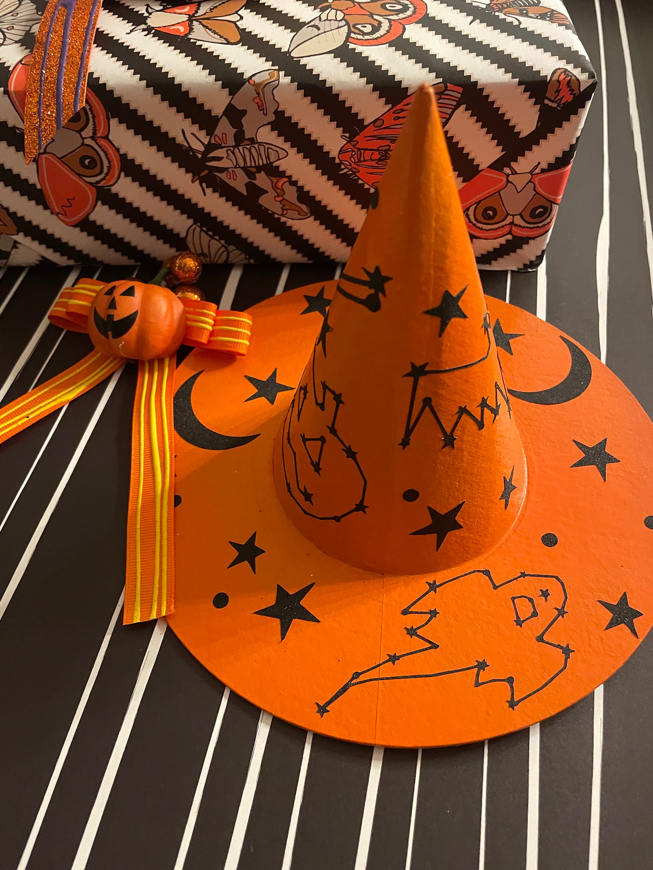 Happy Halloween Witches! We have the perfect hat for your table decor or for a little extra gift wrapping embellishment! Our hat for Halloween is bright orange with black Skelly constellations!